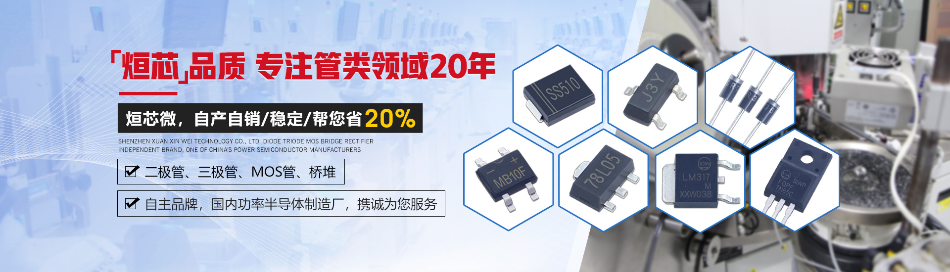 進口的生產設備與測試設備,成熟的生產流程,保證著二極管、三極管、MOS管、橋堆的性能穩定、壽命長!
